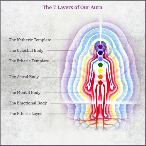 The human aura is described as a hazy bubble of light that surrounds the human being from head to toe. An aura has multiple layers that interact and transmit information between the body through its seven chakra energy centres and the immediate external environment. Each layer of the aura relates to an individual’s physical, mental, emotional, and spiritual conditions. The energetic vibrations of a person’s thoughts, feelings, state of health, consciousness and past experiences are stored in the different layers of the aura.